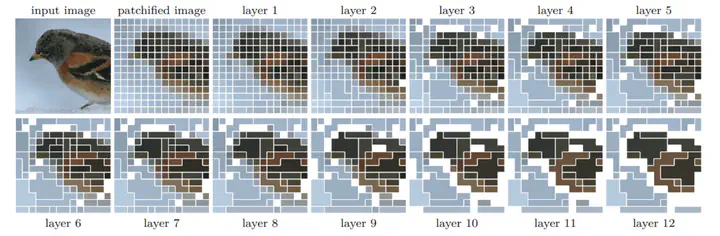 In each transformer block an importance score is calculated for every token $\mathbf{x}_i, i \in {1,…,n}$, where $n = h w$ is the number of tokens1. A threshold $\theta^l \in \mathbb{R}, l \in {1,…,L}$, where $L$ is the number of transformer blocks, determines which tokens to keep and which to prune in each layer; only tokens with an importance score above the threshold are kept.